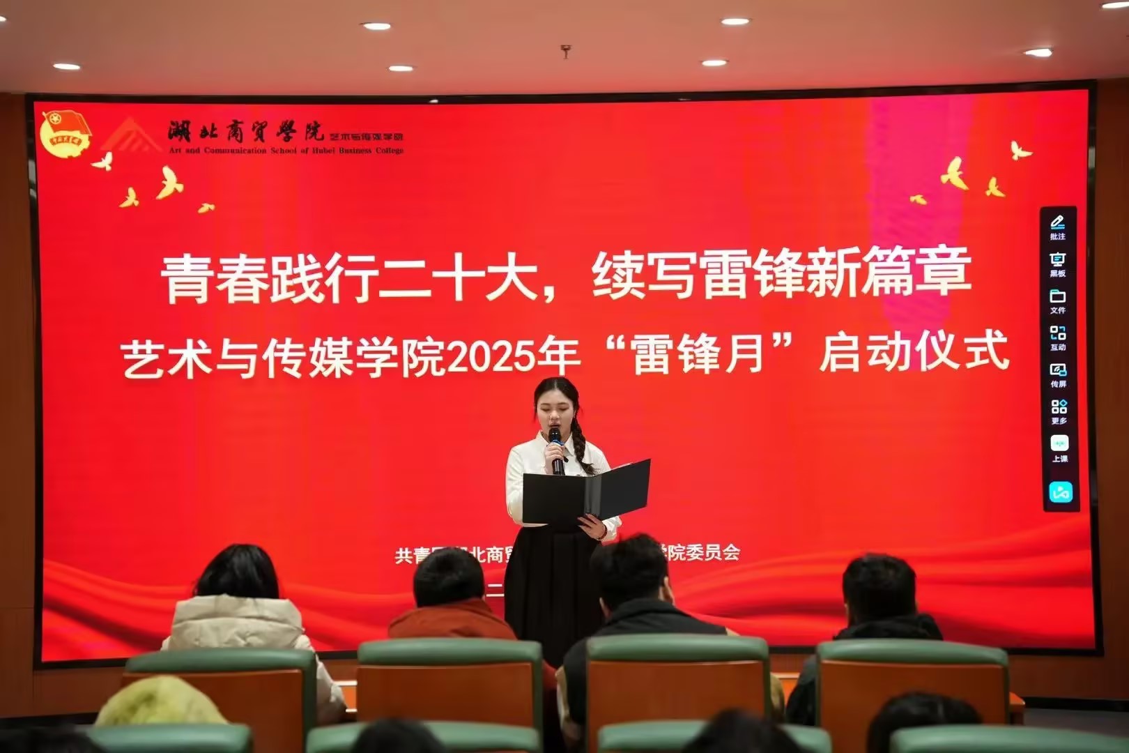 2025年3月4日,在第62个“学雷锋纪念日”到来之际,艺术与传媒学院于图书馆报告厅举行以“青春践行二十大,续写雷锋新篇章”为主题的“雷锋月”启动仪式。湖北商贸学院艺术与传媒学院总支副书记宋杰、团委书记李熇阳、党务秘书罗维、星火志愿服务队指导教师江雨瑶出席本次仪式。