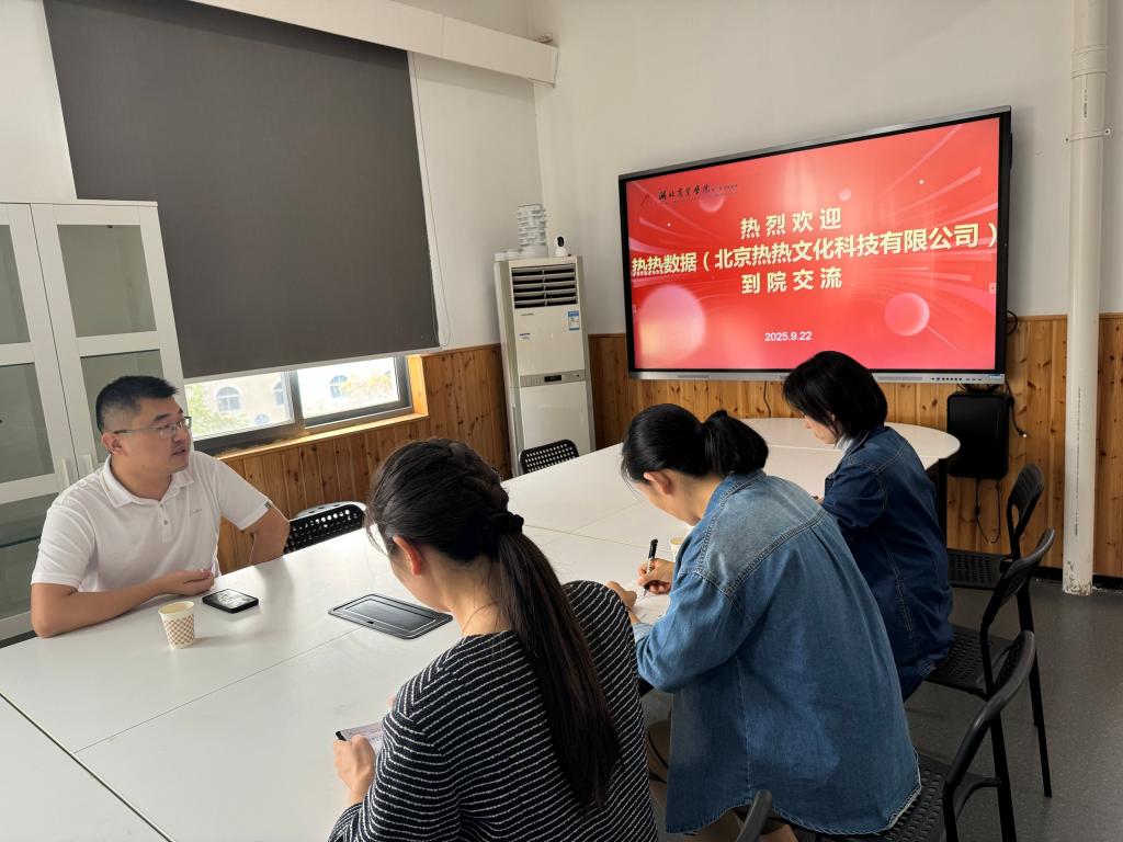 2025年9月22日,艺术与传媒学院与北京热热文化科技有限公司校企合作交流会在学院会议室举行。艺术与传媒学院院长张亚南、党总支书记刘玉洁、副院长袁航与北京热热文化科技有限公司招聘专员陈凯共同出席了本次交流会,双方就学生实习实践、人才培养及校企深度合作等议题进行了富有成效的洽谈。