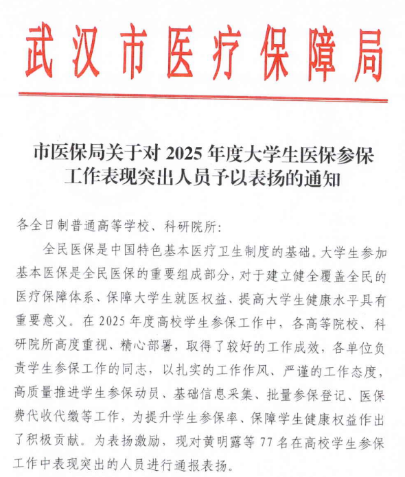 近日,艺术与传媒学院辅导员高三营因在2025年度大学生医保参保工作中表现突出,被武汉市医疗保障局予以表扬。这一份荣誉不仅是对高三营个人工作表现的认可,更体现了湖北商贸学院在落实国家医保政策、守护学生健康权益中的责任担当。