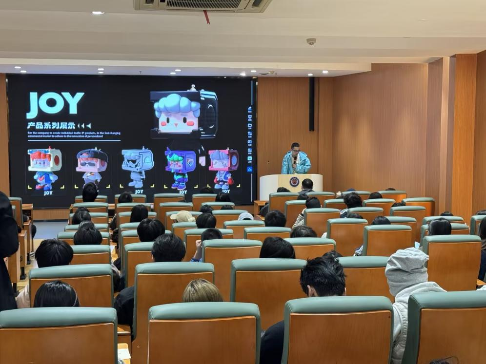 讲座伊始,平田以充满创意的品牌宣传片引入,生动展示了潮代互动设计公司在潮玩设计与手办设计领域的前沿成果。通过对公司核心项目案例的深度剖析,不仅让同学们领略了行业顶尖的设计思维与执行标准,也让大家对互动设计行业的现状与未来趋势有了更为宏观和清晰的认识。
