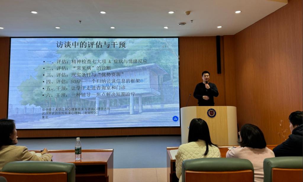 董亚以“大学生一般心理问题的简易评估方法”为题,为辅导员们进行了系统而深入的培训。他紧密围绕“日常管理”这一核心场景,将复杂的心理学知识转化为可操作、易掌握的简易评估方法,详细阐述了大学生中常见的情绪困扰、人际交往障碍、学业压力等一般心理问题的典型表现,并指导辅导员如何通过观察学生的言行举止、情绪变化、社交活动参与度等细微迹象,进行初步的风险识别与判断。