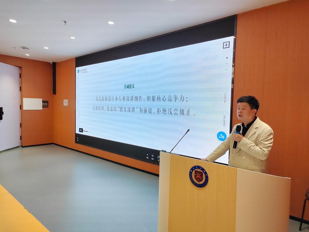 宣讲会伊始,公司创始人王太志作为优秀校友,分享了从一名怀揣设计理想的学生,逐步成长为设计公司创始人的心路历程。结合项目实践经历,生动阐释设计不仅是技艺的积累,更是对生活本质的洞察与表达。面对同学们对薪资与未来职业发展的关切,王太志解析了专业前低后高的“成长型薪酬曲线”的成因与特点,并从技能达标、认知落地、主动意识、项目实战四个维度详细解读环境设计专业实习建议及考核标准。当谈到行业热点AI技术时,王太志分享了“与AI同行,做有灵魂的设计师”的观点。工具永远在迭代,但设计师的人文关怀、创造性思维和独特审美是AI无法替代的“灵魂”,鼓励同学们要用专业技能驾驭工具,用有温度的设计创造可持续的美好空间。同时,王太志结合自身经验提出好设计也需要被看见,鼓励同学们从学生时代就开始有“破圈意识”,不断积累作品、表达观点、打造个人IP,让自己的才华闪耀于更广阔的舞台。